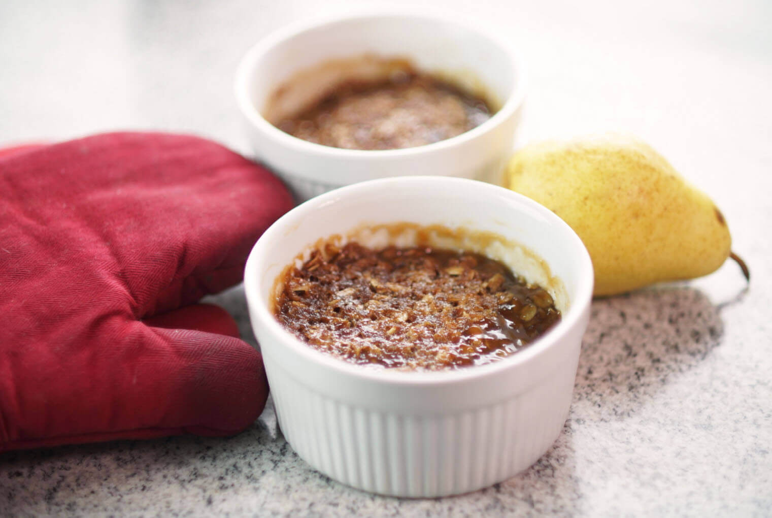 This pear crisp recipe is incredibly simple to make, which means it will be ideal for any of your upcoming holiday get-togethers. Simply skin and chop pears, add lemon juice, maple syrup and spices and then finish with a rich topping made by combining old-fashioned oats, brown sugar, more spices, salt, flour and melted butter. You can bake it in an 8×8 baking dish, or individual ramekins, which is what I opted to do.
