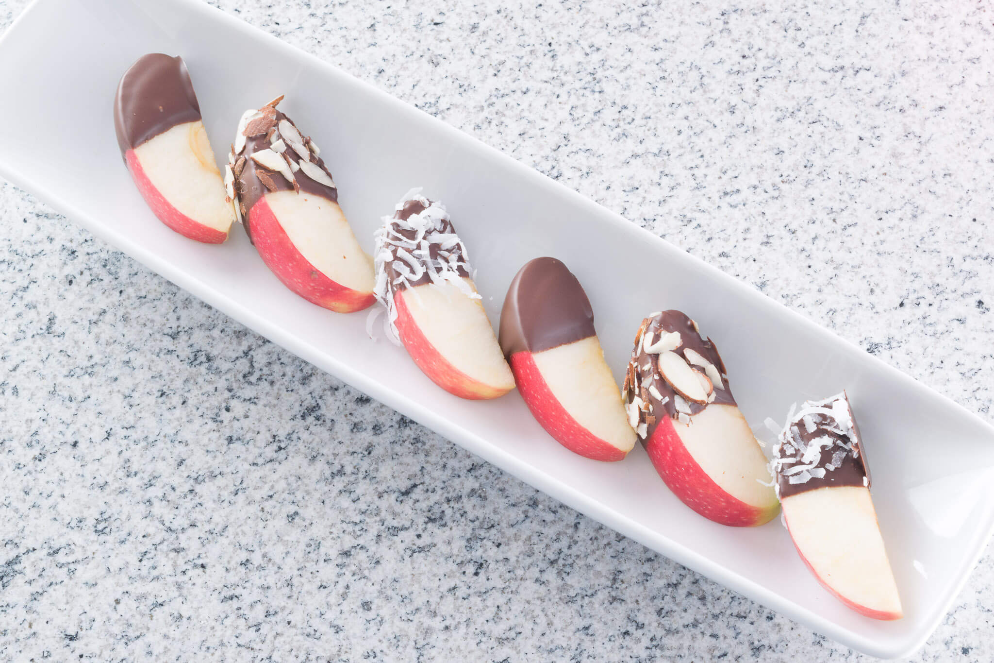Step 5: Now it’s time to dip: Dip one end of the apple slice into the chocolate. Hold to coat.