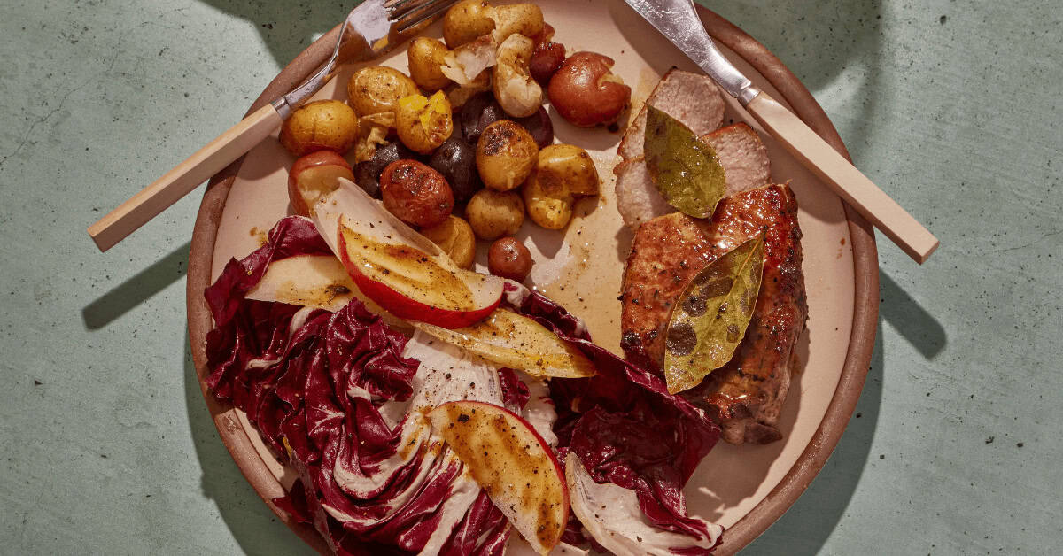 I’ve been making pork chops in a cast iron pan for a while, but inspiration struck the other night when I was finishing up this cider recipe: what if you deglazed the pan with a bit of apple cider to make a sauce for your chops? It was such a delicious result that I ended up making it not only into a glaze for the pork chops but a light dressing for the salad of radicchio and endive that I paired with my pork chops and potatoes.